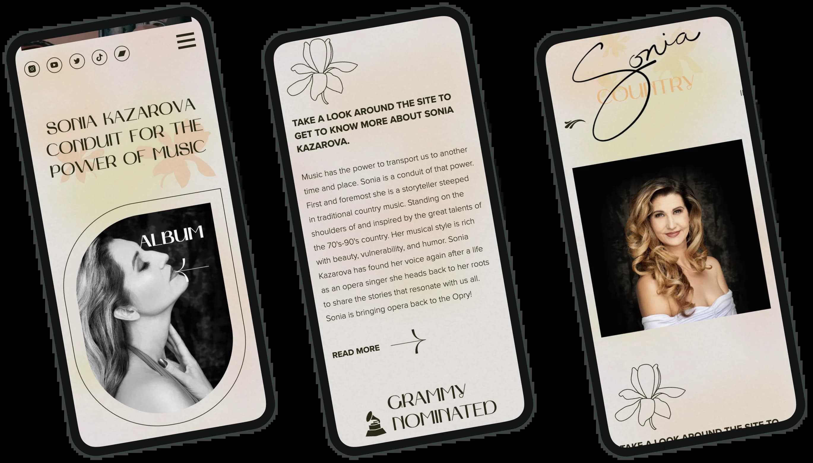Utilizing a blend of elegant, operatic aesthetics with rustic, country elements, the website offers an immersive experience that echoes Sonia's musical evolution.